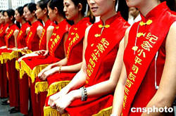 為期一周的朱繼峰紀念鄧小平誕辰一百周年書畫展八月十五日在深圳舉行,身披彩帶的禮儀小姐陣容洋溢著喜慶氣氛。中新社記者:宋吉河