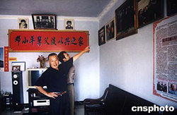 鄧小平百年誕辰前夕,鄧小平的農民表弟淡文全特意在四川廣安的家中布置一個簡易展示板供游人參觀。圖為淡文全在介紹有關情況。中新社記者:肖龍聯