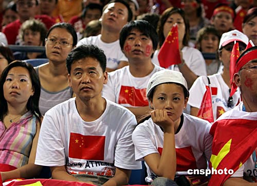 當地時間8月15日,中國男籃在雅典奧運會首輪比賽中迎戰西班牙隊,最終中國隊以大比分負于對手。圖為現場觀戰的中國球迷感到十分失望。中新社記者:任晨鳴