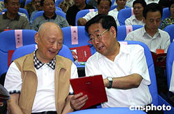 鄧小平的胞弟鄧墾(左)與會,并與中共四川省委書記張學忠(右)坐在一起。