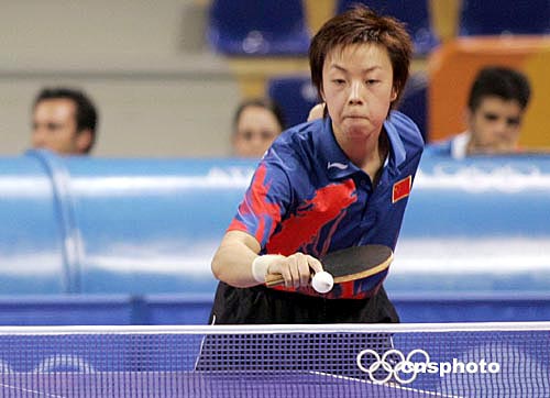 在雅典時間18日晚進行的奧運乒乓女單比賽中,中國選手張怡寧以四比一戰勝中國香港選手柳絮飛,晉級八強。中新社記者:張煒
