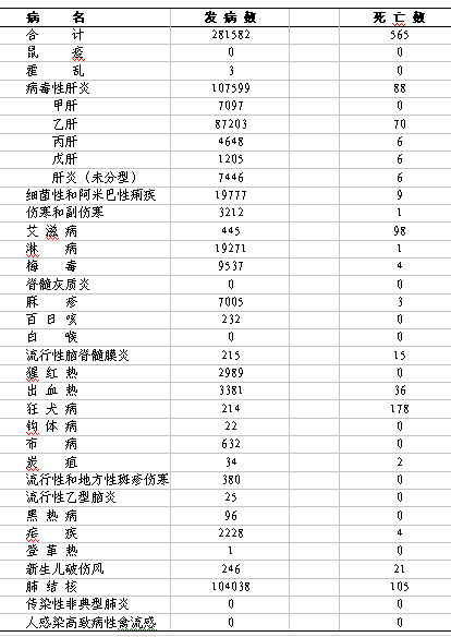 2004年12月,報告發病數居前五位的病種為:肺結核、乙型肝炎、細菌性和阿米巴性痢疾、淋病、梅毒,占發病總數的85.17%。