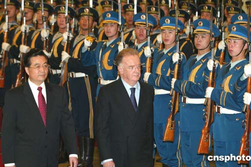胡錦濤舉行儀式歡迎葡萄牙共和國總統若熱·桑帕約訪華。作者:滿會喬