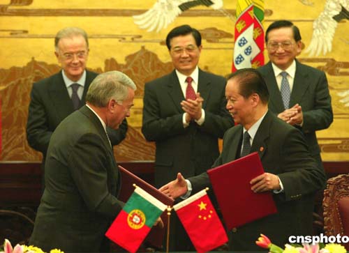 中國與葡萄牙一月十二日在北京簽署多個雙邊合作協議文本,中國國家主席胡錦濤與葡萄牙總統桑帕約出席簽字儀式。作者:滿會喬