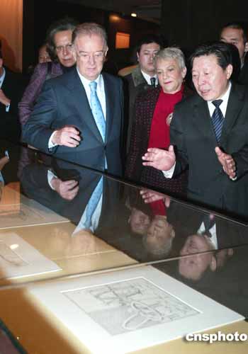 《葡萄牙覓見中國(guó)》展覽一月十三日在北京開幕,葡萄牙總統(tǒng)桑帕約(左二)在中國(guó)文化部長(zhǎng)孫家正(右一)陪同下參觀展出的中國(guó)古觀象臺(tái)圖紙。作者:滿會(huì)喬