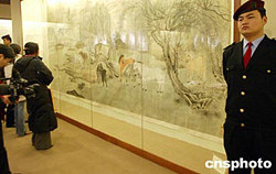 近日,重張開業(yè)的北京懋隆藝術(shù)館,展示館藏精品《柳林十駿圖》,該圖長523cm,寬256cm設(shè)色絹本,由張善仔、張大千合作而成,是迄今張氏兄弟合作繪制的最大畫作,極具鑒賞與收藏價值。中新社記者:錢興強(qiáng)