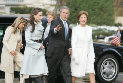 1月20日,美國總統(tǒng)布什和夫人勞拉及其兩個(gè)女兒前往圣約翰大教堂。(美聯(lián)圖)