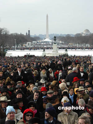 當天華盛頓雪后初晴,但天寒地凍,數十萬人聚集在從國會山到華盛頓紀念碑的街道和草坪上,參加布什的就職典禮。他們當中既有為布什連任歡呼者,也有不滿布什政府的抗議示威者。