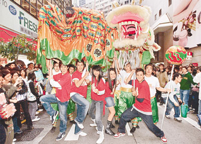 Kenny(左起)、阿Don、Yumiko、Isabella及Steven在鬧市舞龍,甚有氣勢!(圖片來源:太陽報)