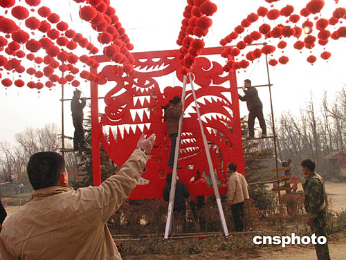 二月一日,一幅直徑四米的中國剪紙《吉祥如意圖》在河南鄭州搭建完畢。這是為2005春節(jié)商城民俗文化廟會主會場而建。該剪紙根據中國傳統(tǒng)剪紙技法、經過三天的時間精心設計制作出來的,在歷年同類廟會中,該圖最大。春節(jié)廟會結束后將申請吉尼斯世界記錄。作者:慎重