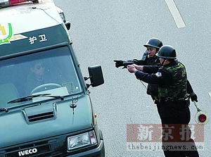 春節(jié)期間,為加強(qiáng)對(duì)金融單位的保護(hù),北京市公安局進(jìn)行了一次攔截被搶運(yùn)鈔車的演習(xí)。下午1時(shí)30分左右,左安門橋下的南二環(huán)向西的主路上,車流如梭,一輛綠色的北京振遠(yuǎn)護(hù)衛(wèi)運(yùn)鈔車在車流中見縫插針地飛速前行,三四輛警車緊隨其后,旁邊的車輛很快讓出路來(lái)。看見幾個(gè)路口全部有警方布控后,運(yùn)鈔車?yán)^續(xù)朝前“逃竄”,并從開陽(yáng)橋往北,駛向菜市口大街。