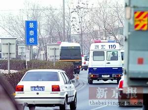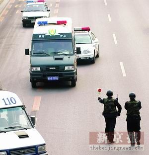 在健宮醫(yī)院西門口,菜市口大街由南向北主路停止行車。三名刑警呈三角狀,站在主路中央。約5分鐘后,三輛警車夾著一輛綠色的運(yùn)鈔車駛來(lái),在離“三人陣”50米遠(yuǎn)處,前排的刑警對(duì)運(yùn)鈔車舉起禁行標(biāo)志。與此同時(shí),兩輛警車向運(yùn)鈔車靠攏。