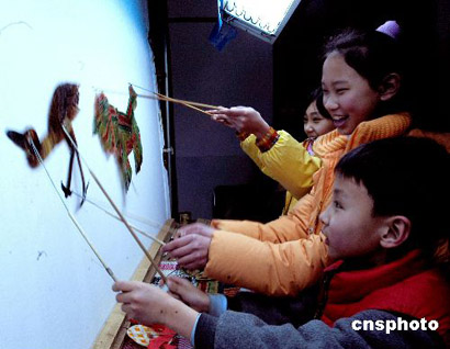 春節期間,幾位小孩在北京市一處文化館玩皮影戲,他們自編自演皮影戲,玩得樂不可支。作者:王麗南