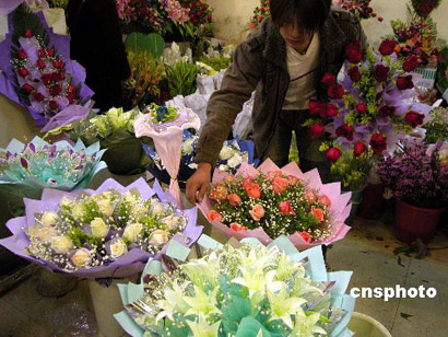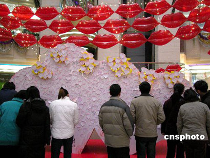 情人節前夕,錫城市場上的各種情人應節禮品、紅色玫瑰等受到年青人的追捧。無錫一些商家推出的許愿墻上許心愿活動異常火爆,對對情侶紛紛買來許愿牌、同心結,寫上祝福貼在各種“心”形墻上,希望能將情意綿綿的情話捎給心愛的人。作者:潘正光