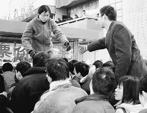 10時左右,人越來越多,市場前的紅旗路上人擠著人,綿延1公里,抬腳都困難,人群中不斷傳出被踩到腳的尖叫聲,10分鐘時間里,記者愣是沒走出200米。汽車、自行車和小商販的三輪車夾在人群中間動彈不得,209路公交車無奈只好改線,一位乘客嘟囔著:“早就該實行交通管制。”雖然主辦方明確規定不得在場外招聘,可路邊的“招聘”牌子還是一個挨著一個,散發的各種小廣告隨地可見,5元一張的門票被炒到10元。