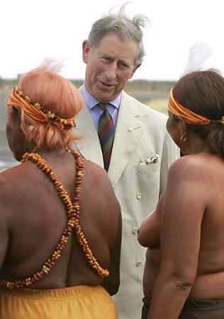 3月2日,查爾斯前往澳大利亞內地進行訪問。王儲一抵達愛利斯泉,就由赤裸著上身的土著婦女熱情迎接,王儲看得兩眼不知該往哪里瞧才好。土著人又給他端上一桌蟲蟲大餐,更讓王儲吃不消。