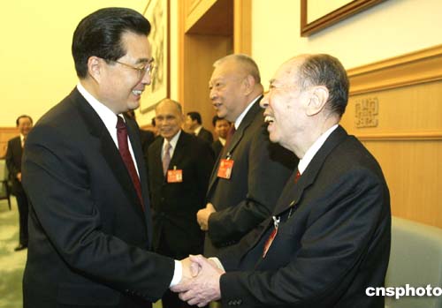 全國政協十屆三次會議三月三日在北京開幕,國家主席胡錦濤在開幕式前問候出席會議的全國政協副主席馬萬祺。作者:廖文靜
