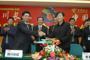 中新網(wǎng)3月7日電 3月4日,“中國電信-四川長虹4008業(yè)務(wù)合作簽約儀式”在四川省綿陽市隆重舉行。長虹電器股份有限公司副總經(jīng)理鄔江與中國電信集團公司大客戶事業(yè)部梁志平總監(jiān)代表雙方在協(xié)議書上簽字。