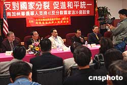 美國洛杉磯華人政治評論家與當(dāng)?shù)貎S胞僑領(lǐng),三月十九日云集中國城參加座談會,異口同聲支持中國通過實施《反分裂國家法》。作者:賈國榮