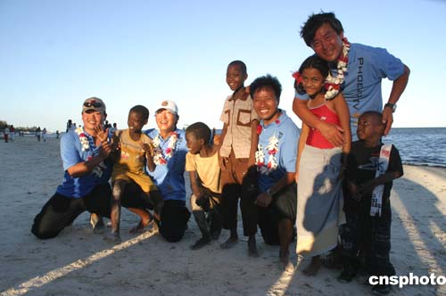 香港鳳凰衛視“鳳凰號”單桅帆船完成鄭和下西洋航程十六日抵達肯尼亞蒙巴薩港,圖為“鳳凰號”隊員們十九日與肯尼亞兒童在一起。作者:邢健