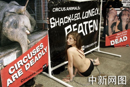 2005年3月22日,美國人道對待動物協會的會員裸體躺在時代廣場上,抗議玲玲馬戲團(Ringling Brother and Barnum & Bailey Circus)在紐約演出。他們帶著手銬腳鐐,身上涂著假傷疤,抗議動物在馬戲團遭受虐待。