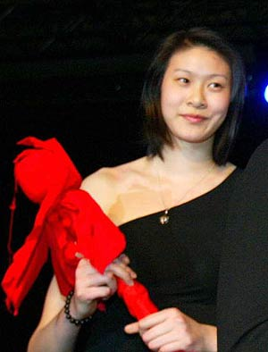 一襲黑色長(zhǎng)裙,露出半邊肩膀,是好萊塢剛流行過的式樣。趙蕊蕊顯然是無法習(xí)慣這樣性感的裝束,羞答答地上了臺(tái)。直到迎上帥哥索普贊許的眼神,更是露出一臉羞澀的笑容。“還真不習(xí)慣這樣穿,別扭極了。”說話聲音一如平時(shí)的爽朗,“還是運(yùn)動(dòng)衣更符合我的氣質(zhì)。”這樣的曳地長(zhǎng)裙,還會(huì)再穿么?“也許不會(huì)了吧。”