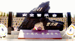 據介紹,該礦難警示碑位于“一一·二八”遇難礦工公墓正前方,由兩塊堅實的煤炭雕塑構成了一個巨大的“人”字坐落在花崗巖的碑座上。碑座的正中是一個黃銅色的礦工帽。碑座前面鐫刻八個醒目大字“安全為天警鐘長鳴”,背面銘刻著在此次礦難中遇難的一百六十六名礦工的名字。碑的后面,是一排排翠柏環繞的遇難礦工墓碑。