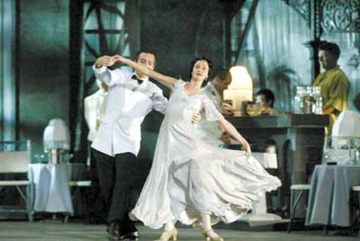 演出的開場(chǎng)很新鮮,一面虛擬的大幕徐徐拉開,巨大的銀幕上出現(xiàn)了當(dāng)年那部老電影《卡薩布蘭卡》的片頭,黑白鏡頭將觀眾帶回到半個(gè)世紀(jì)前發(fā)生一段浪漫故事的卡薩布蘭卡。因?yàn)槭鞘状魏铣膳啪殻鄶?shù)演員沒有穿演出服。盡管如此,演員們的精彩表演還是贏得了在場(chǎng)記者的掌聲。(張學(xué)軍)