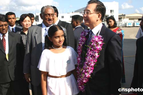 中國國務院總理溫家寶今天下午抵達斯里蘭卡首都科倫坡,圖為溫家寶愉快地接受斯里蘭卡少女獻花。作者:齊彬