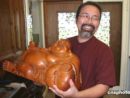 臺(tái)灣花蓮市古玩具店“畬歆閣”老板方永清,近日向中新社記者展示他收藏的三義木雕精品彌勒臥佛。苗栗縣三義鄉(xiāng)是木雕重鎮(zhèn),三分之一人口從事木雕業(yè),產(chǎn)品獨(dú)步臺(tái)灣全島。作者:董會(huì)峰