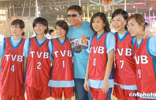香港電視劇《學警雄心》為加強宣傳,15日與警察籃球代表隊舉行友誼賽,眾多女藝員加盟此次活動。圖為香港藝員苗僑偉(男)為女藝員們打氣助威。