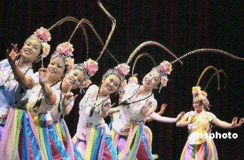 二00五年美國中華演藝學院華裔學生匯報公演四月十七日在加州圣塔克拉拉大學舉行。圖為華裔學生們表演中國古典舞《俏花旦》。作者:陳鋼
