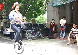 今年四十九歲的呂布是廣西南寧市一位民間藝術家,他可在獨輪車上自如演奏中國和西方的樂器達一個小時之久。呂布愛好二胡,二00一年他開始迷上雜技獨輪車,苦練三年多后,他如今已能邊騎獨輪車邊演奏薩克斯、二胡、笛子、葫蘆絲等四種樂器。作者:蔣雪林