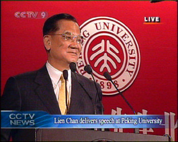 連戰(zhàn)在演講開始時說,今天我和內(nèi)人偕同中國國民黨大陸訪問團一起來到北京大學(xué),非常榮幸,也非常溫馨。剛才我了解到北京大學(xué)就是當(dāng)年燕京的校址,我的母親(上世紀(jì))三十年代在這里念書,所以今天來到這里可以說是倍感親切。