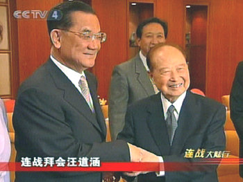 海協(xié)會(huì)長(zhǎng)汪道涵與中國(guó)國(guó)民黨主席連戰(zhàn)會(huì)面(央視截圖)