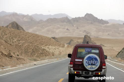 中新網5月3日電 二零零五年五月三日,穿越可可西里聯想鋒行探險隊車隊抵達北京——拉薩的109國道2500公里處。