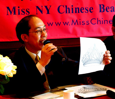 紐約華裔小姐選美會執行總裁阮健華十一日向媒體介紹稱,五月和六月完成兩次初選后,由評委會決定進入決賽的十二名候選佳麗。攝影:龔文謨