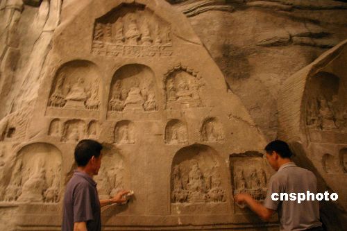 五月十八日,重慶中國三峽博物館正在為開館緊張準備。兩名工匠正清潔“龍灘河摩崖造像”!褒垶┖幽ρ略煜瘛笔侨龒{博物館內最“重量級”的文物,其重量超過三十噸,由兩塊整體切割的造像巖石組成。三峽蓄水達到一百三十五米時,“龍灘河摩崖造像”就被淹沒,早前當地文物部門用了近兩個月時間,將造像完整切割。重慶中國三峽博物館于二○○二年十月二十八日開工,將于今年六月十八日正式開館,預計將展出文物八千到一萬件,可入藏三十萬件文物,主要收藏重慶及三峽地區文物。作者:郭晉嘉