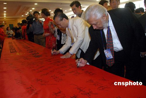 由國(guó)務(wù)院僑務(wù)辦公室和中國(guó)海外交流協(xié)會(huì)主辦的“第三屆世界華僑華人社團(tuán)聯(lián)誼大會(huì)”五月十九日在北京開幕,圖為與會(huì)代表在“增進(jìn)共識(shí)凝聚力量反對(duì)臺(tái)獨(dú)促進(jìn)統(tǒng)一”橫幅上簽名。作者:張勤