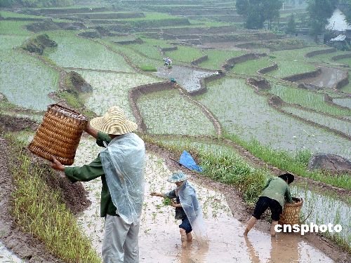 5月20日,重慶市云陽縣紅獅鎮中心壩田園,當地群眾正在冒雨插秧。眼下,正值三峽庫區農村“雙搶”(大春搶種搶收)季節,一年一度的水稻栽插處在節骨眼上。但2005年的三峽梅雨季節比常年來得早,半月前便呈現三天兩頭雨的“孩兒臉”氣候。為了不誤農時,峽江兩岸農村處處可見村民斗雨整田插秧的大忙景象。據了解,早到的多雨天氣對中高山及時出苗十分有利,但雨水也對秧苗固窩、勞作出行造成影響。雖然天公喜怒無常、冷熱頻換,人們對搶抓糧食生產的熱情不減。作者:饒國君