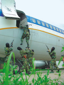 時機到了!隱蔽在車廂里的特戰隊員一躍而起,掀開篷布,破窗而入。公共汽車上的幾名“歹徒”還沒反應過來就被生擒……