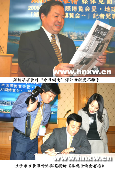 5月20日上午十點,在名古屋市舉行的2005年愛知世博會“湖南走入世博”媒體見面會上,湖南省省長周伯華看到“今日湖南”海外專版樣報時愛不釋手,他說:“我在世博會中國館館日時就看到了這個專版,特別高興,這個海外專版辦得很好!敝懿A省長還高興地手捧“今日湖南”海外專版樣報在“湖南走入世博”媒體見面會的會標前讓記者攝影拍照留念。