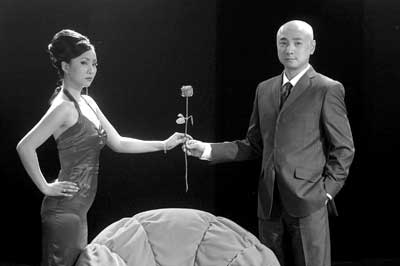 5月30日下午,記者走進煤礦文工團的安源小劇場,只見陶虹身穿一件紫紅色的露肩晚禮服,徐崢則穿著一身筆挺的西服。他們兩人分別站在一個紅色布藝沙發的兩側,頭頂上是大量的聚光燈。劇場里的陣勢和時尚節目的拍攝別無二致。可是,陶虹、徐崢卻是在為他們二人主演的戲劇《最后一個情圣》拍攝電視宣傳片。