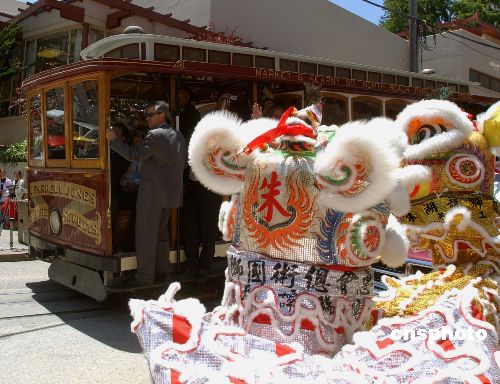 六月三日,在美國舊金山出席聯合國世界環境日活動的世界各國市長和嘉賓,到華埠乘坐古老的有軌電車,受到舞獅舞龍的歡迎。作者:賈國榮
