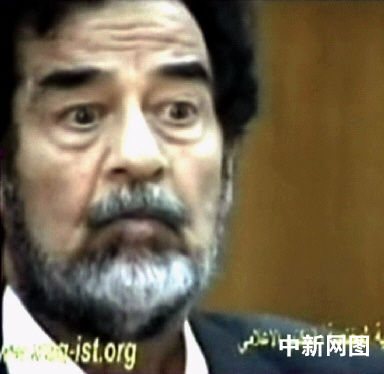 6月13日公布的伊拉克前總統薩達姆在一不明地點接受質詢的電視照片。伊拉克特別法庭表示,一名法官已向薩達姆提出質詢,調查一什葉派穆斯林聚居的村莊里數十名男子被殺害事件。1982年,薩達姆曾在該村逃過一次暗殺。