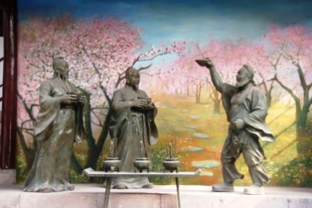 踏上陡峭的臺階走上二樓,劉、關、張桃園三結義的雕塑面江而立,率先映入眼簾。三人神態栩栩如生,背后桃花掩映,給人意氣風發之感覺。周圍畫廊多為名家字畫雕刻,各處樓板都有白色標注,蓋取舊址之原樣翻蓋如此。三樓大殿當中為張飛銅像,此前泥塑無法整體遷移,匠心獨具之雕塑家仿照原樣,雕刻成張飛青銅座像。銅像若有所思,仿佛正在為蜀漢江山、百姓安樂遐思。銅像周圍有張飛四個歷史時期泥塑,主題分別為鞭打都郵、義釋嚴顏、大戰長坂坡及閬中遇難。