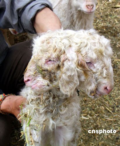 圖:甘肅景泰一小尾寒羊產(chǎn)下一只雙頭小羊
