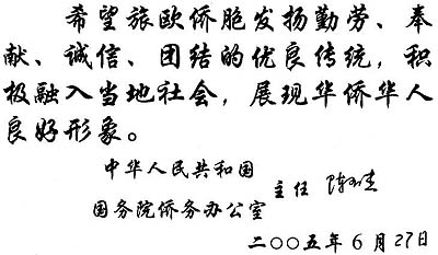 中新網6月29日電 據歐洲時報報道,中國國僑辦主任陳玉杰近日為歐洲華文報紙《歐洲時報》題詞,向廣大旅歐僑胞致意。