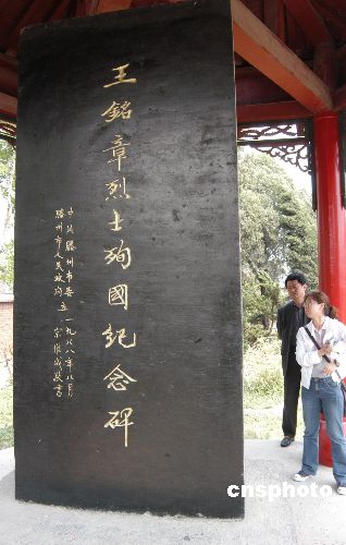 記者懷著崇敬的心情來到山東省滕州市烈士陵園,拜偈當年滕縣保衛戰中為國捐軀的王銘章將軍等英烈。王銘章的紀念碑廳靜靜地坐落在西北面。紀念碑上的碑文記載:一九三七年日寇挑起“七·七”事變,王銘章師長預立遺囑,誓死殺敵報國,遂率八千巴蜀健兒出川北上抗日。