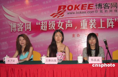七月五日,由博客網(wǎng)主辦的“超級女聲重裝上陣”活動新聞發(fā)布會在北京舉行。備受中國內地網(wǎng)民關注的歌手韓真真(圖右1)全程代言此次比賽。“網(wǎng)絡紅人”木子美、芙蓉姐姐、流氓燕、竹影青瞳等作為嘉賓進行全程賽況點評。